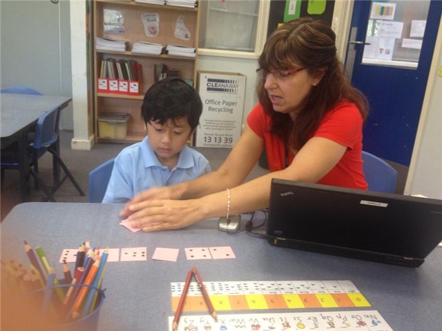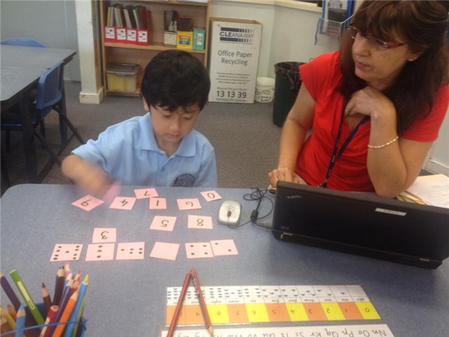 Cô cũng đưa những tấm cát có các chấm như các hình đô-mi-nô và cát có viết các con số rồi yêu cầu con tôi xếp các cát thành từng cặp sao cho các số lượng chấm tương ứng với chữ số trong cát.