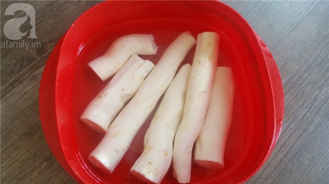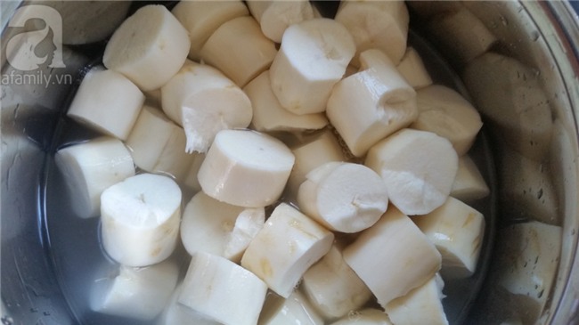 Sắn lột vỏ, cắt khúc ngâm vào chậu nước gạo hoặc nước muối loãng khoảng 2 giờ đồng hồ cho hết độc tố.