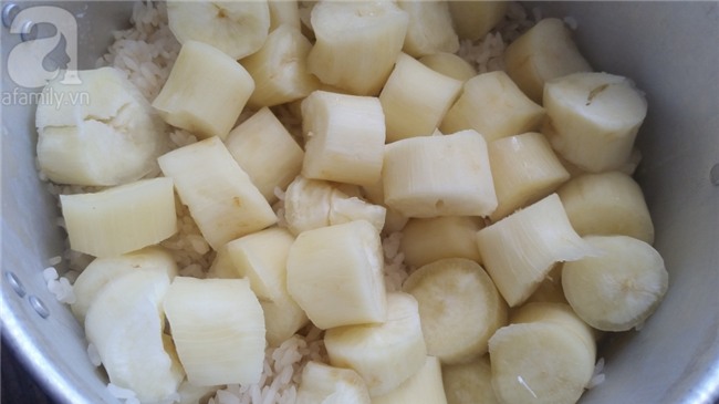 Cho gạo vào chõ, xóc đều cùng chút muối trắng, đặt lên bếp nấu khoảng 25 đến 30 phút là xôi chín. Khi xôi chín, đánh đều xôi lên rồi cho sắn vào hấp cùng xôi thêm 5 đển 7 phút để sắn chín kỹ.