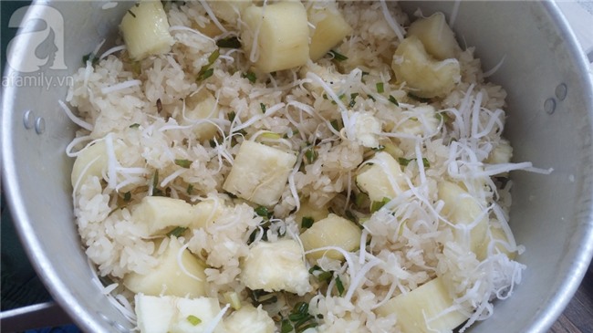 Tiếp đó cho phần dừa nạo vào xới đều cùng xôi sắn, dưới phần mỡ hành đã phi thơm vào rồi lại xới đều lần nữa. Đậy vung nồi xôi thêm 5 phút nữa rồi bắc xuống.