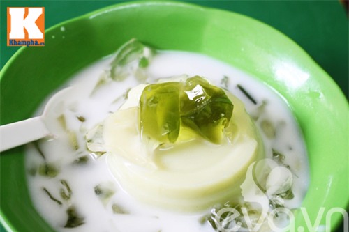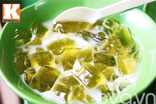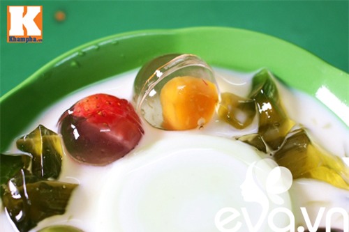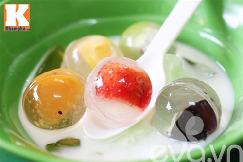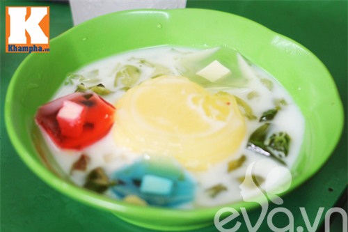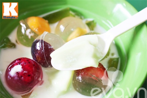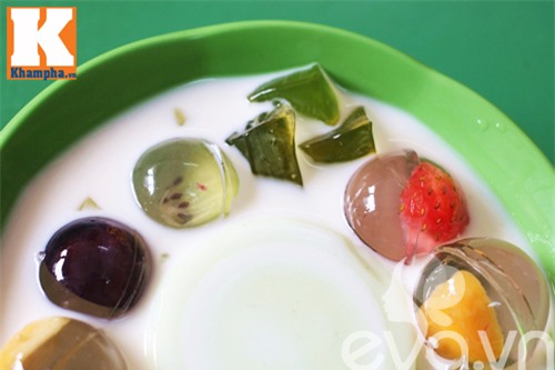 Với thạch phô mai, món ăn đắt hàng nhất ở quán là thạch phô mai cầu vồng. Bát chè gồm những viên thạch đủ màu được chan nước cốt dừa thanh mát. Cái dai, giòn của thạch thơm mùi hoa quả quyện cùng nhân phô mai béo ngậy và nước cốt dừa bùi bùi mang đến cho người ăn nhiều trải nghiệm vị giác mới lạ.