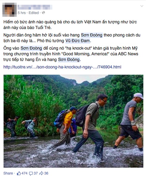 Bức ảnh phó thủ tướng Vũ Đức Đam lội suối vào hang Sơn Đoòng cùng các thành viên của đoàn làm phim. (Ảnh: Tuổi trẻ).