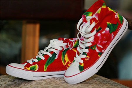 Không chỉ xuất hiện trên trang phục, các bạn trẻ còn biến hóa họa tiết chăn con công trên giày, hay may túi xách, khăn... |
