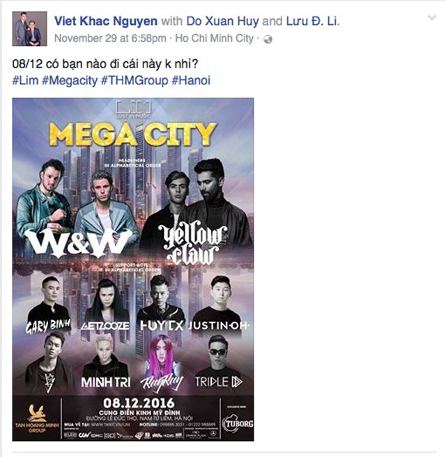 Mới đây, LIM Entertainment xác nhận sẽ mời bộ đôi DJ tên tuổi Yellow Claw & W&W đến Hà Nội ngày 8/12/2016. Yellow Claw (Top48) , W&W (Top13) là những DJ tới từ Hà Lan cực kỳ nổi tiếng bởi hai thể loại nhạc mà mỗi nhóm theo đuổi là Trap và Big Room.