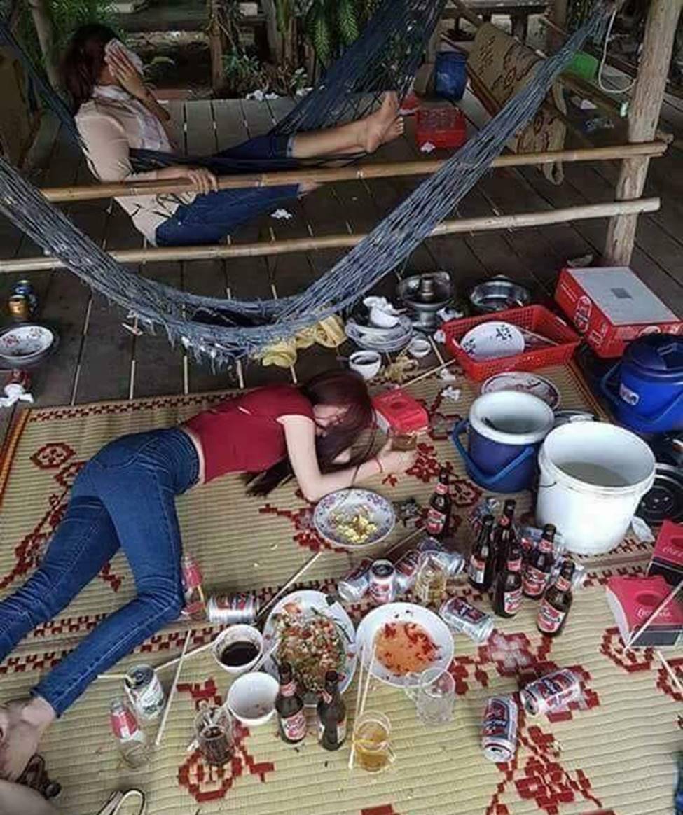Ngã thế này chắc được miễn rửa bát đĩa.