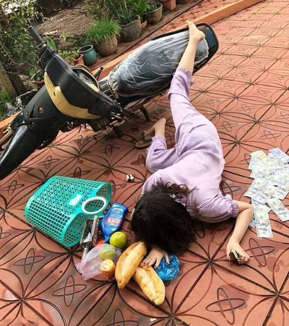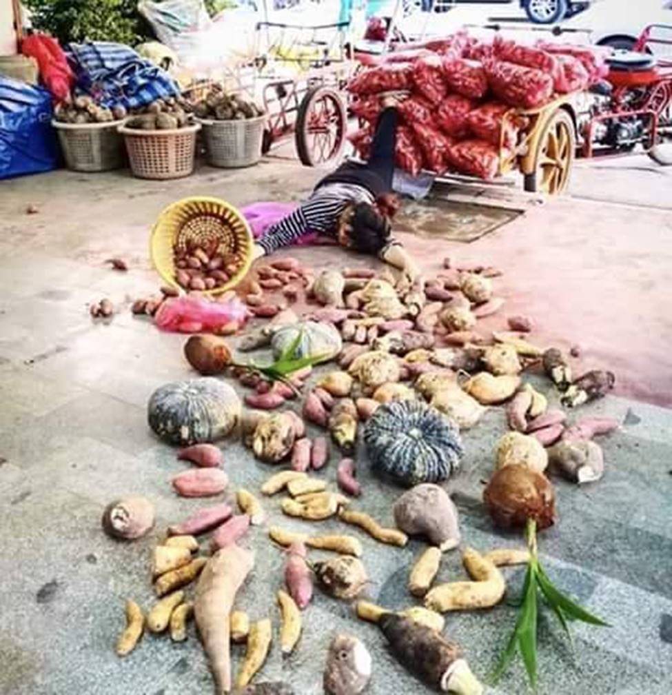 Vừa đi chợ về đã ngã "sấp mặt" thế này.