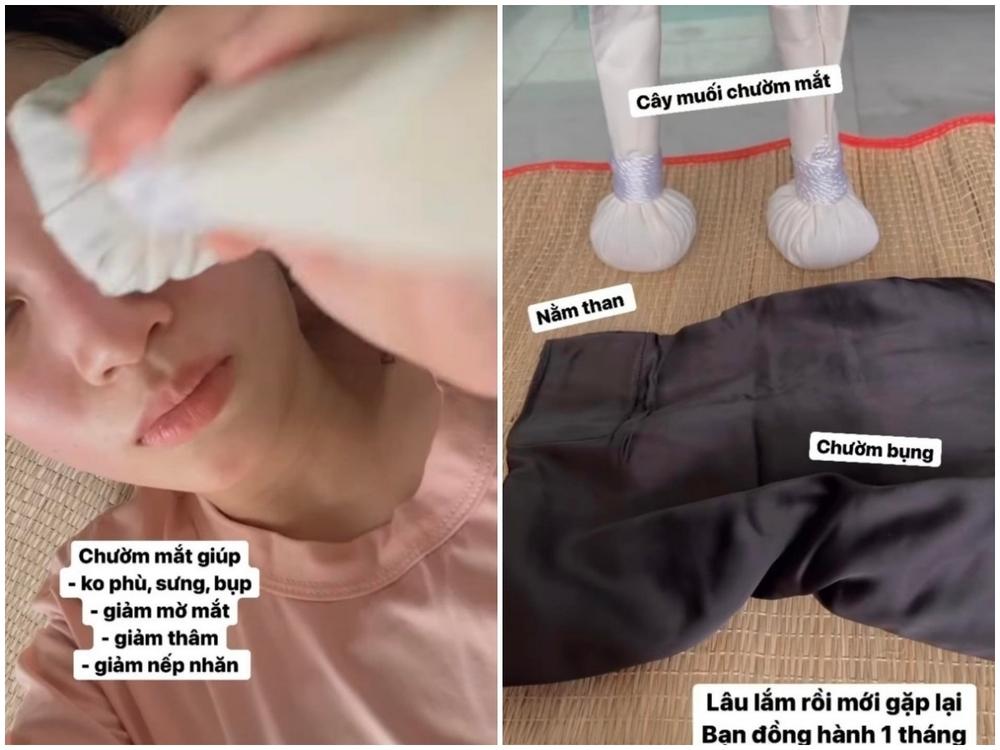 Để có được sắc vóc ấy, ngay khi sinh con được vài ngày, cô đã thực hiện biện pháp chườm bụng, chườm mặt đều đặn. Điều này sẽ giúp Joyce Phạm giảm bớt mỡ bụng, sưng phù ở mắt, giảm thâm và nếp nhăn.