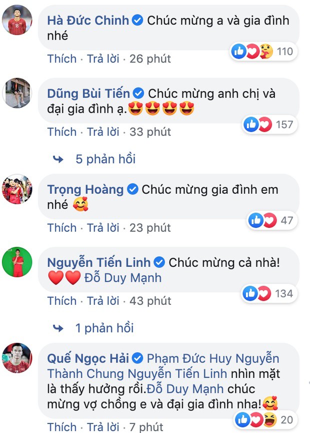 Sau khi khoe những hình ảnh đầu tiên của quý tử nhà mình, vợ chồng trung vệ CLB Hà Nội Duy Mạnh - Quỳnh Anh nhận được hàng nghìn lời chúc mừng trên trang cá nhân.