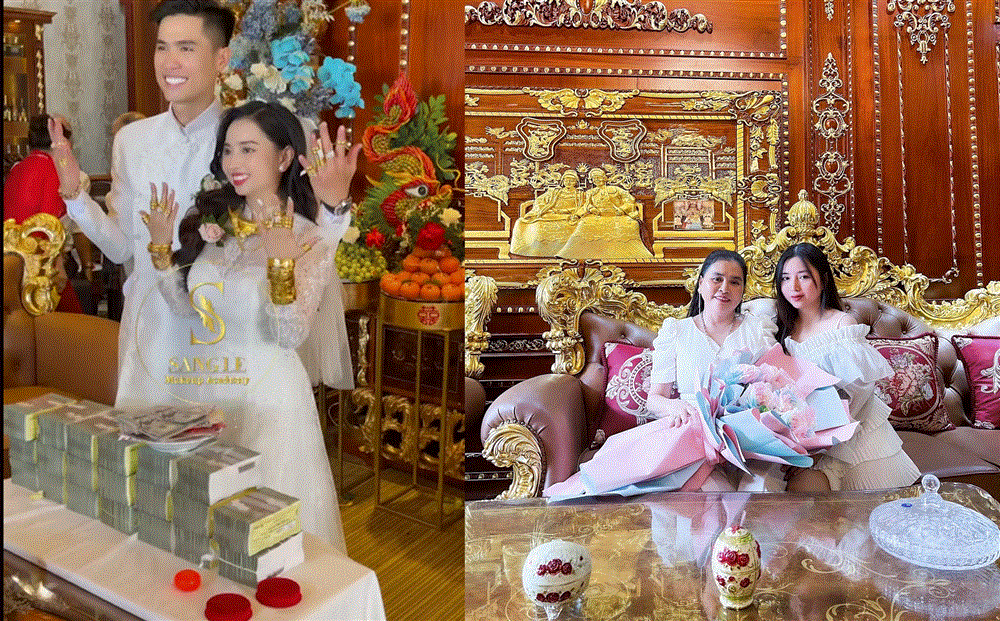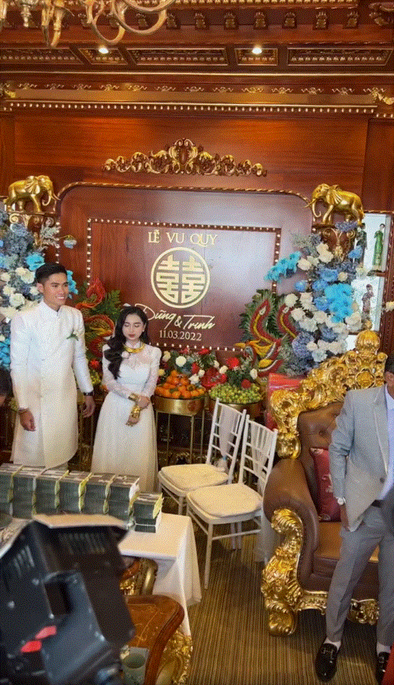 Trong clip livestream trên trang cá nhân của cô dâu T.T, cư dân mạng còn choáng ngợp hơn với đám cưới được tổ chức với quy mô hoành tráng. Được biết gia đình nhà T. đã dành riêng 600 triệu để mua hoa tươi trang trí cho bữa tiệc. Chưa hết, ngôi nhà mà cô gái này ở cũng có nhiều đồ vật dát toàn vàng 24k như bàn ghế, đèn, cột...