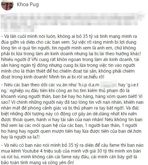 Trước thông tin trái chiều, sau đó Khoa Pug cũng lên một "tút" dài, chia sẻ về sự việc liên quan. Anh khẳng định: "Không ai bỏ 35 tỷ và tính mạng mình ra đùa giỡn và diễn cho các bạn xem.
