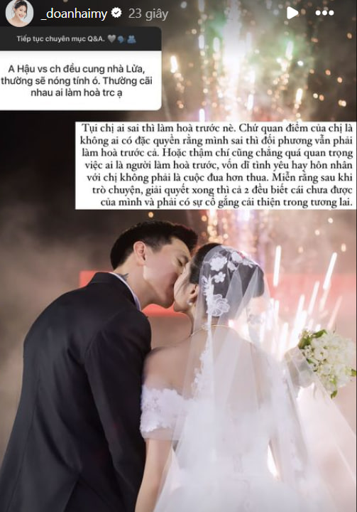 "Tụi chị ai sai thì làm hoà trước. Chứ quan điểm của chị là không ai có đặc quyền rằng mình sai thì đối phương vẫn phải làm hoà trước cả. Hoặc thậm chí cũng chẳng quá quan trọng việc ai làm hoà trước, vốn dĩ tình yêu hay hôn nhân với chị không phải là cuộc đua hơn thua. Miễn rằng sau khi trò chuyện, giải quyết xong thì cả hai đều biết cái chưa được của mình và phải có sự cố gắng cải thiện trong tương lai".