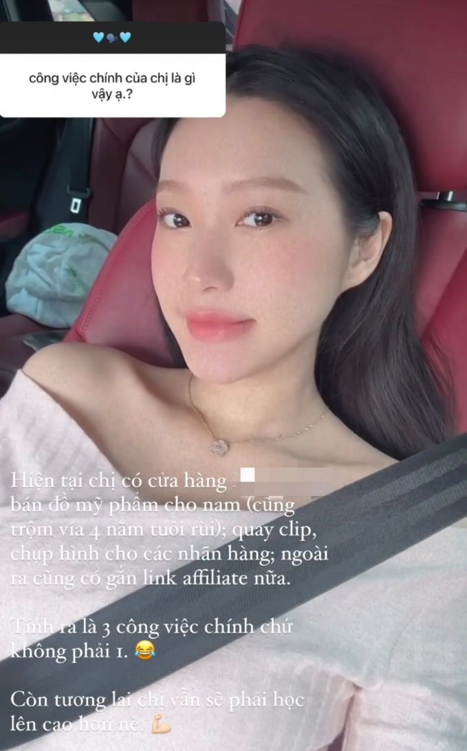 "Hiện tại chị có cửa hàng bán đồ mỹ phẩm cho nam, quay clip, chụp hình cho các nhãn hàng, ngoài ra cũng có gắn link appfiliate nữa. Chính ra là 3 công việc chứ không phải 1. Còn tương lai chị vẫn sẽ phải học lên cao nữa nè", cô nàng trả lời câu hỏi trên tài khoản Instagram.