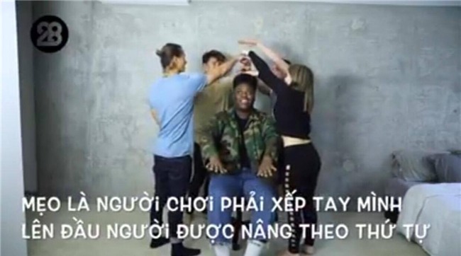 Trong phần chia sẻ mẹo chơi, người hướng dẫn cho biết, người chơi phải xếp tay mình lên đầu người được nâng theo thứ tự, không chạm tay nhau giữ khoảng 10 giây và sau đó rút tay ra theo thứ tự. Điều ngạc nhiên sẽ xảy ra sau đó. Thay vì lúc đầu rất khó khăn, chật vật vẫn không thể nâng cơ thể người lên được thì sau đó, bạn có thể biến thành lực sĩ rất dễ dàng.