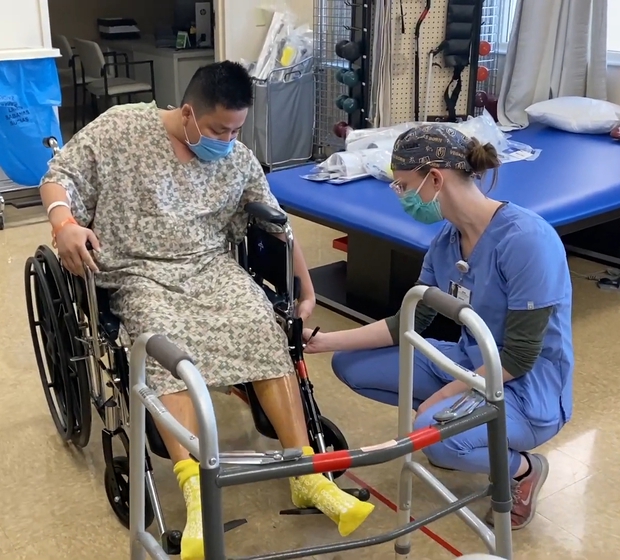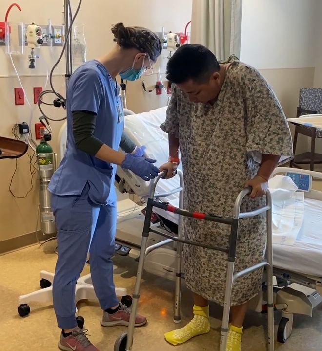Sau đoạn chia sẻ một chút với người hâm mộ, Khoa Pug đã xuống giường và bắt đầu tập đi trên đôi chân mới. Tuy nhiên, những bước đi đầu tiên của anh chàng khá khó khăn, anh phải nhờ hoàn toàn đến dụng cụ hỗ trợ và sự giúp đỡ của bác sĩ vật lý trị liệu. Trong quá trình di chuyển, Khoa Pug liên tục nhăn nhó vì đau đớn và phải trở về giường bệnh nằm để có thể nghỉ ngơi. Tuy nhiên, anh tỏ vẫn ra rất quyết tâm, vừa tập đi vừa review kỹ lưỡng về hành trình gian nan của chính bản thân mình.
