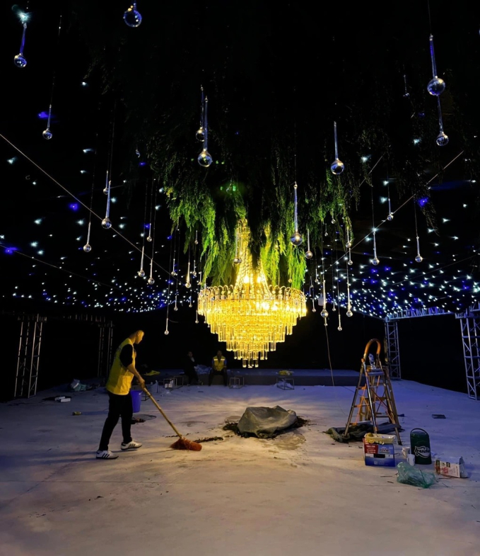 Sáng ngày 27/12, một số cây trang trí cũng đã được vận chuyển đến nhà Quang Hải, bạt nhung đen được phủ kín toàn bộ khu vực tổ chức.