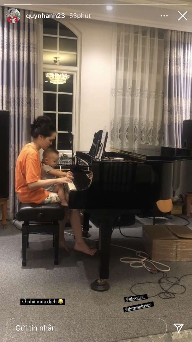Cụ thể, trên Instagram cá nhân, cô nàng đăng story vừa trong con vừa chơi đàn với caption: "Ở nhà mùa dịch". Trong khoảnh khắc này, Quỳnh Anh mặc quần áo ở nhà khá đơn giản, tóc tai buộc tạm chứ không chải chuốt cầu kì. Dù không rõ cận cảnh gương mặt nhưng cũng dễ đoán được cô nàng đang để mặt mộc, về đúng vai mẹ bỉm sữa.