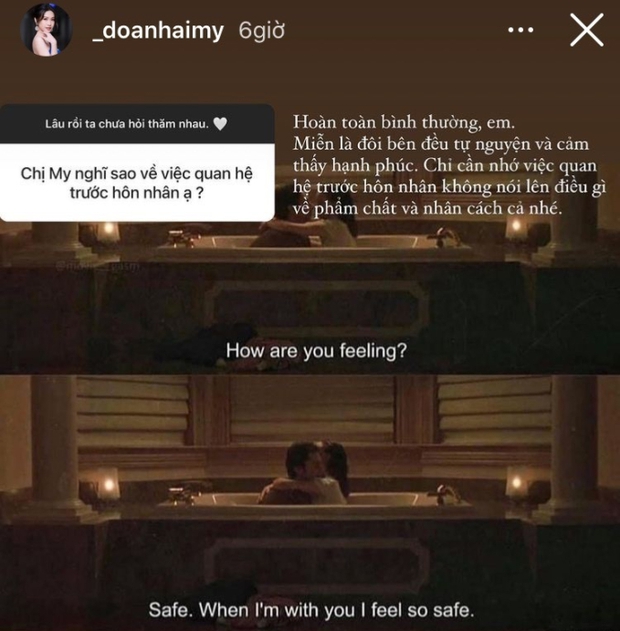 Ngoài ra, người đẹp Hà thành cũng không ngần ngại bày tỏ quan điểm về chuyện hòa hợp của nam nữ khi quan hệ khi nhận được hỏi: "Bạn trai chửi em have sex tệ và rồi im lặng với em thì em nên làm như thế nào ạ". Doãn Hải My đã dành những tâm sự khá dài để bày tỏ suy nghĩ của bản thân.