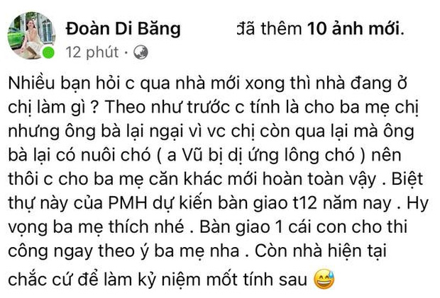 Theo đó, nhận được nhiều câu hỏi rằng sau khi xây xong "lâu đài" 400 tỷ, hai vợ chồng đại gia Đoàn Di Băng và doanh nhân Nguyễn Quốc Vũ sẽ làm gì với căn nhà cũ hiện đang sinh sống ở Quận 7 (Sài Gòn). Đoàn Băng Di thật thà trả lời: Chị tính cho ba mẹ chị nhưng ông bà lại ngại vì vợ chồng còn qua lại nhà cũ, ông bà lại có nuôi chó (anh Vũ bị dị ứng lông chó). Vậy nên thôi chị cho ba mẹ căn khác mới hoàn toàn vậy.