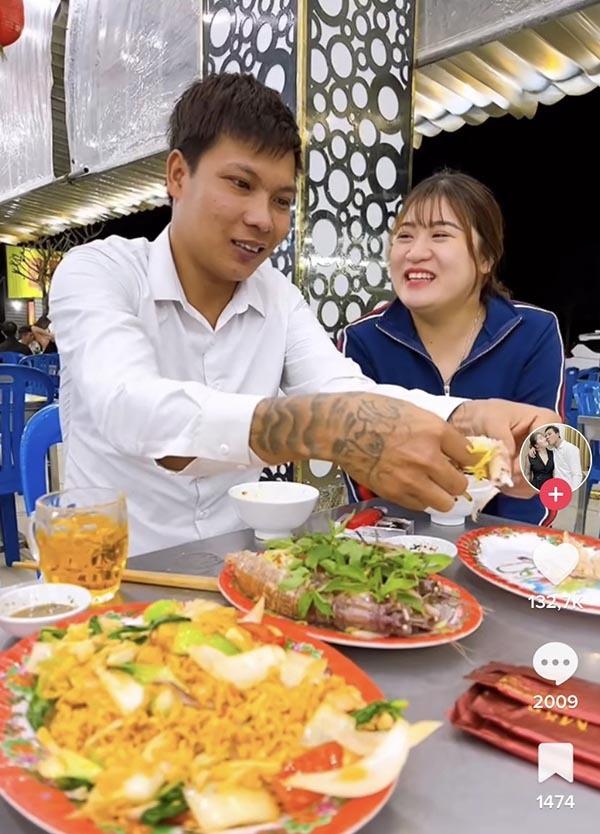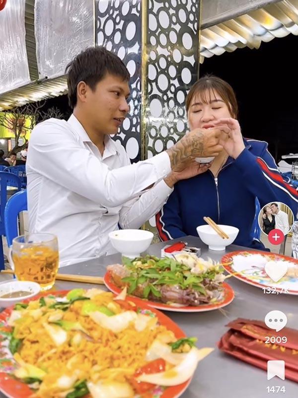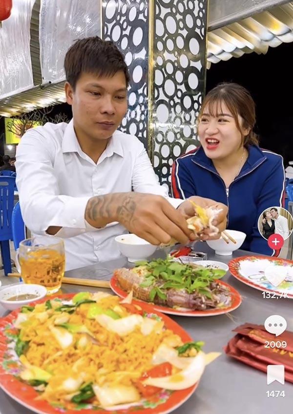 Trong hình, anh ăn diện bảnh bao, đang ngồi bóc hải sản cho vợ như để chuộc lỗi. Chị Kim Thủy ngồi cạnh, thỉnh thoảng lại nở nụ cười hạnh phúc, nhìn về phía chồng.