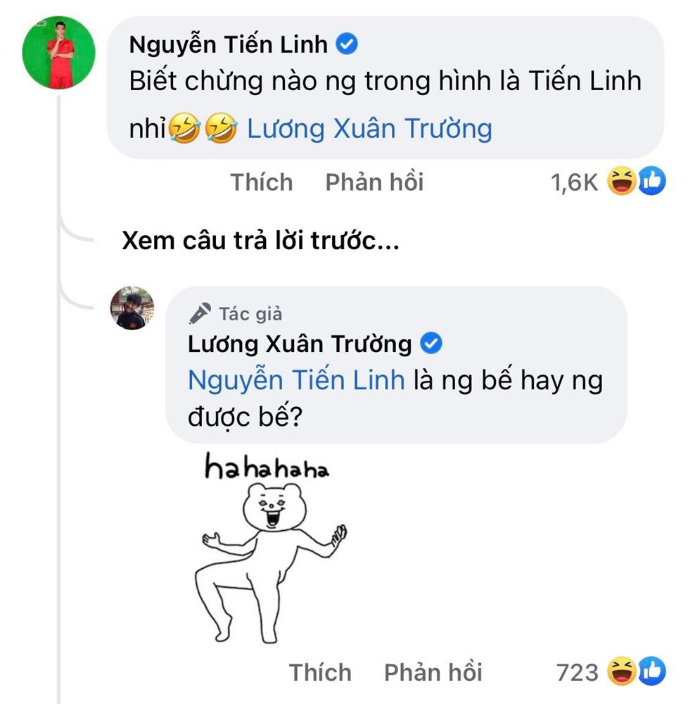 Nếu dàn cầu thủ gửi lời chúc mừng đến chàng tiền vệ gốc Tuyên Quang thì Nguyễn Tiến Linh lại “tự thương chính mình” bởi hiện tại anh chàng vẫn đang cô đơn lẻ bóng và tự hỏi: “Biết chừng nào người trong hình là Tiến Linh nhỉ?”. Thấy vậy, Xuân Trường không những không an ủi mà còn trêu chọc đàn em: “Là người bế hay người được bế?”.