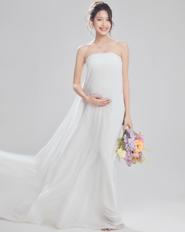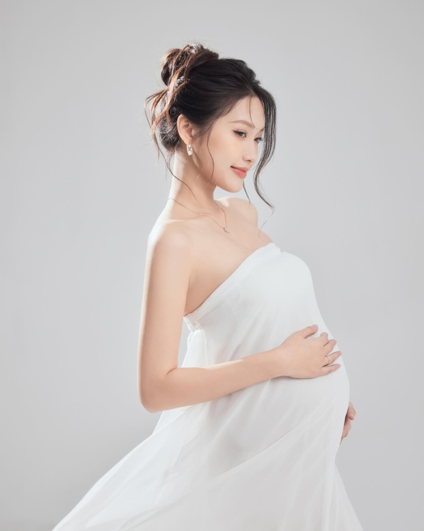 Ngoài bụng bầu vượt mặt, Hải My vẫn giữ được vóc dáng thon gọn, xương quai xanh mảnh mai cuốn hút