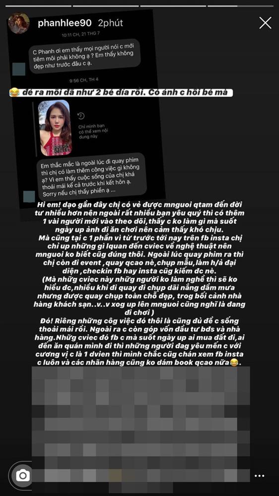 Cụ thể, Phanh Lee tiết lộ: "Dạo gần đây chị có vẻ được mọi người quan tâm đời tư nhiều hơn nên ngoài rất nhiều bạn yêu quý thì có thêm một vài người mới vào theo dõi, thấy chị không làm gì mà suốt ngày đăng ảnh đi ăn chơi nên cảm thấy khó chịu.