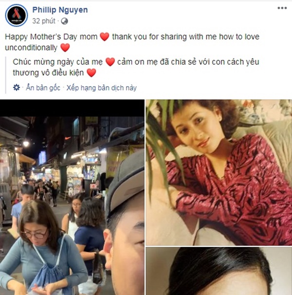 Hôm nay là Ngày của Mẹ nên ngay từ sáng sớm, anh chàng Phillip Nguyễn đã đăng tải những bức ảnh xinh đẹp của đấng sinh thành để chúc mừng kèm dòng trạng thái: "Cảm ơn mẹ đã dạy cho con cách yêu thương vô điều kiện".