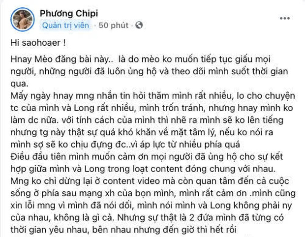 Bài đăng thông báo chuyện chia tay đã bị Mèo Sao Hỏa xóa đi sau đó. Cô nàng cũng viết trên trang cá nhân rằng: "Mình ổn... Hiện tại mình không biết nói gì, nhưng bọn mình đã chính thức dừng lại... Mình sẽ off một thời gian. Xin lỗi vì tất cả".