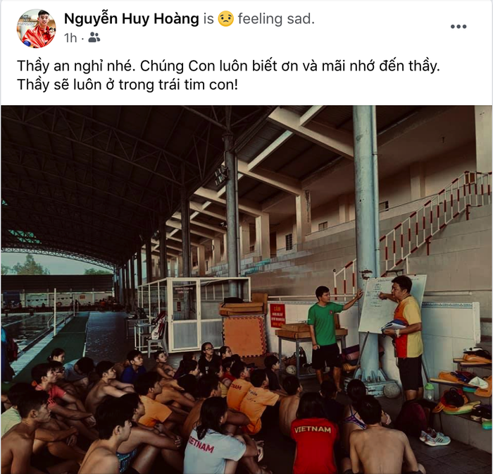 Đi kèm dòng trạng thái, Huy Hoàng chia sẻ tấm hình HLV Huang đang chỉ dạy cho các VĐV bơi lội trẻ trong quá khứ. HLV Huang là chuyên gia nước ngoài góp sức lớn trong công tác đào tạo trẻ bơi lội Việt Nam.