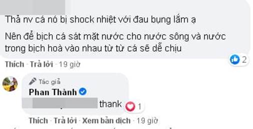 Tuy nhiên, ngay bên dưới đã có người nhắc nhở chàng thiếu gia vì phóng sinh không đúng cách: "Thả như vậy cá hay bị shock nhiệt với đau bụng lắm ạ. Anh nên để bịch cá sát mặt nước để nước sông và nước trong bịch hoà vào nhau từ từ cá sẽ dễ chịu hơn". Đáp lại góp ý từ người này, Phan Thành đã gửi lời cảm ơn.