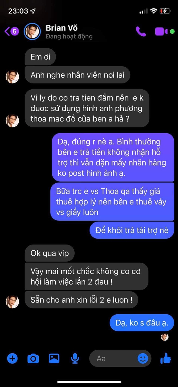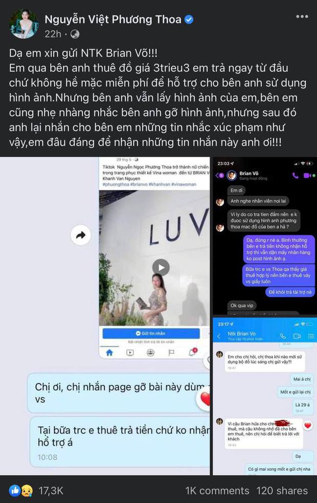 Bài "phốt" NTK Brian Võ trên trang cá nhân của Việt Phương Thoa. Khi mới liên hệ mượn váy, phía NTK muốn hỗ trợ FREE cho cô nhưng với thỏa thuận là nữ TikToker phải đăng clip review chiếc váy. Tuy nhiên sau khi thử váy, cô nàng muốn trả tiền sòng phẳng và không nhận hỗ trợ.