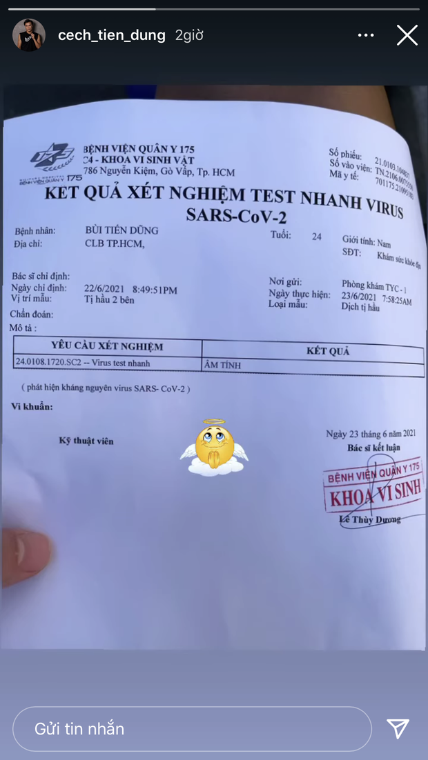 Mới nhất, ngay trước ngày ĐT Việt Nam hết thời gian 7 ngày cách ly, Bùi Tiến Dũng đã có cập nhật trên Instagram. Cụ thể, thủ môn CLB Tp.HCM đã đăng ảnh kết quả test nhanh virus SARS-CoV-2 âm tính kèm icon biết ơn.