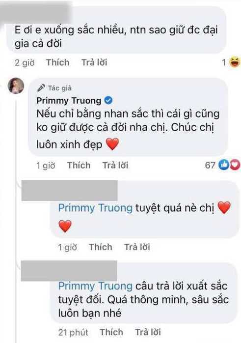 Primmy Trương đáp lại: "Nếu chỉ bằng nhan sắc thì cái gì cũng không giữ được cả đời nha chị. Chúc chị luôn xinh đẹp".
