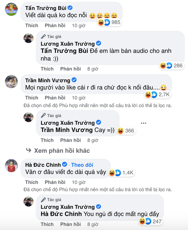 Ở phần bình luận, bạn bè, người thân và dân mạng đã để lại rất nhiều bình luận chúc mừng cặp đôi trẻ. Riêng hội đồng đội ở ĐT Việt Nam như Tấn Trường, Minh Vương, Đức Chinh thì vẫn như mọi khi, nhanh nhảu bay vào cà khịa chuyện Xuân Trường viết dài quá.