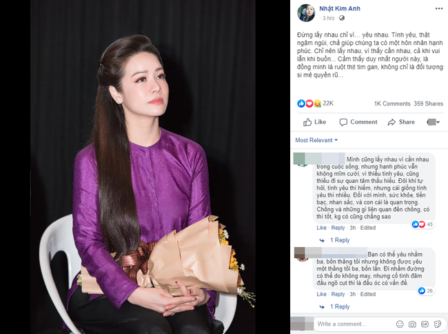 Đừng lấy nhau chỉ vì… yêu nhau. Tình yêu, thật ngậm ngùi, chả giúp chúng ta có một hôn nhân hạnh phúc. Chỉ nên lấy nhau, vì thấy cần nhau, cả khi vui lẫn khi buồn... Cảm thấy duy nhất người này, là đồng minh là ruột thịt tim gan, không chỉ là đối tượng si mê quyến rũ...", Nhật Kim Anh chia sẻ.