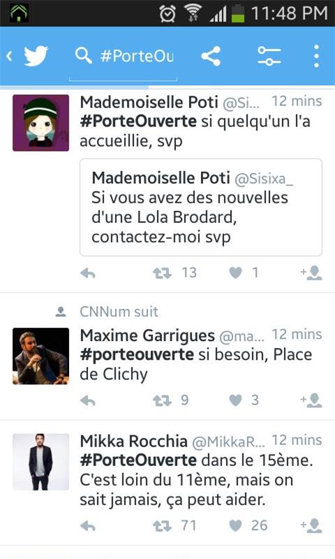 Trên mạng xã hội Twitter, hashtag phổ biến nhất hiện giờ là #PorteOuverte và #PortesOuvertes, có ý nghĩa "Cửa mở đấy". Người ta sử dụng hashtag để những người đang kẹt tại các địa điểm xảy ra khủng bố không thể về trong đêm có thể liên lạc và tới ở nhờ. Hàng trăm du khách và dân thường nhờ có phong trào đoàn kết này của người dân Paris đã được đảm bảo an toàn, có chỗ nghỉ ngơi sau thảm kịch kinh hoàng.