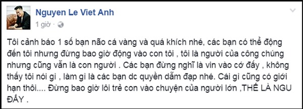 Trong tâm trạng bức xúc, Việt Anh viết: "Tôi cảnh báo một số bạn não cá vàng và quá khích nhé! Các bạn có thể động đến tôi nhưng đừng bao giờ động vào con tôi.