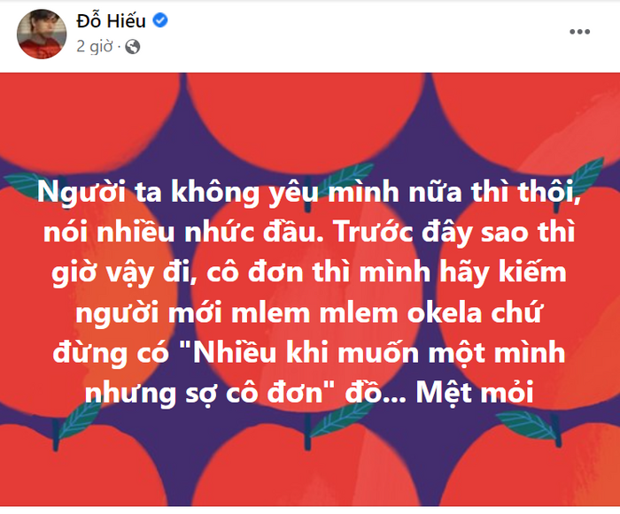 Nam nhạc sĩ đăng đàn: "Người ta không yêu mình nữa thì thôi, nói nhiều nhức đầu. Trước đây sao thì giờ vậy đi, cô đơn thì mình hãy kiếm người mới mlem mlem okela chứ đừng có 'Nhiều khi muốn một mình nhưng sợ cô đơn' đồ... Mệt mỏi".