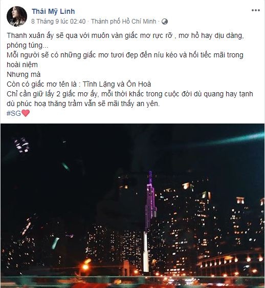 Tuy nhiên mới đây, Á hậu Thái Mỹ Linh đã mở lại facebook và chia sẻ status: "Thanh xuân ấy sẽ qua với muôn vàn giấc mơ rực rỡ, mơ hồ hay dịu dàng, phóng túng... Mỗi người sẽ có những giấc mơ tươi đẹp đến níu kéo và hối tiếc mãi trong hoài niệm. Nhưng mà, còn có giấc mơ tên là: tĩnh lặng và ôn hòa. Chỉ cần giữ lấy 2 giấc mơ ấy, mỗi thời khắc trong cuộc đời dù quang hay tạnh dù phúc hoạ thăng trầm vẫn sẽ mãi thấy an yên.