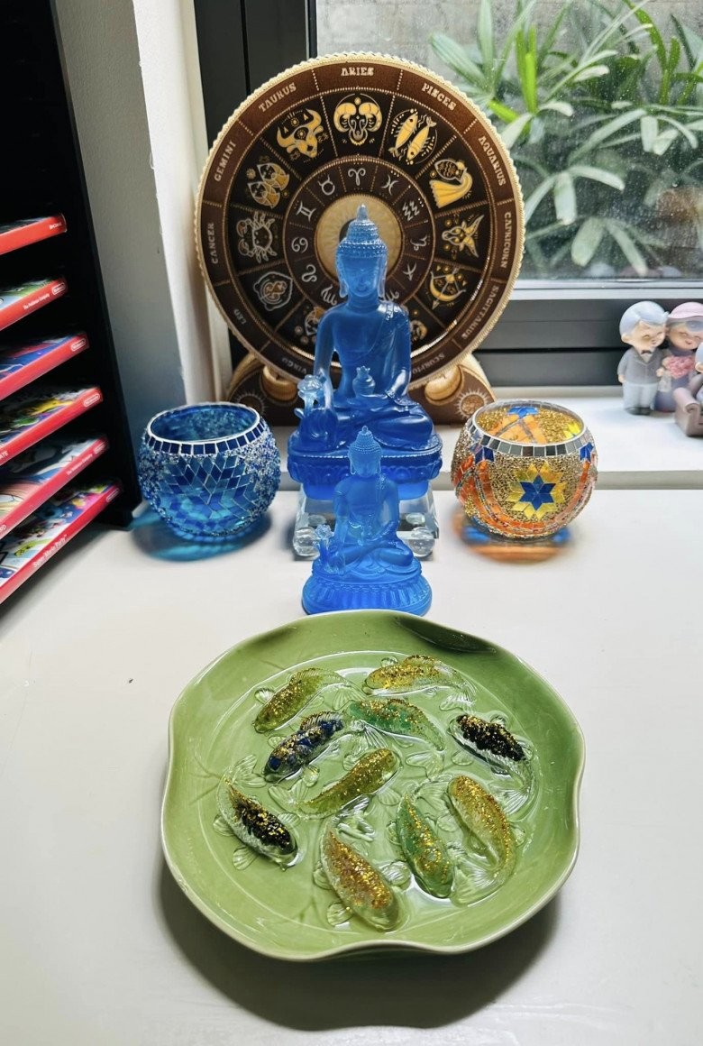 Góc an yên này có tượng Phật màu xanh lạ mắt, đồ decor, đàn cá, cốc nến... tất cả đều độc đáo. Ai nhìn thấy cũng phải thốt lên thật nhẹ nhõm, bình yên.