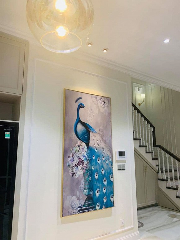 Bức tranh con công được treo cạnh tủ lạnh, giữa khu vực bếp và cầu thang lên tầng.