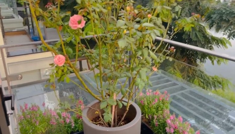 Tác phẩm của anh với một dàn hoa phi yến quanh ban công, điểm thêm chút hoa hồng.