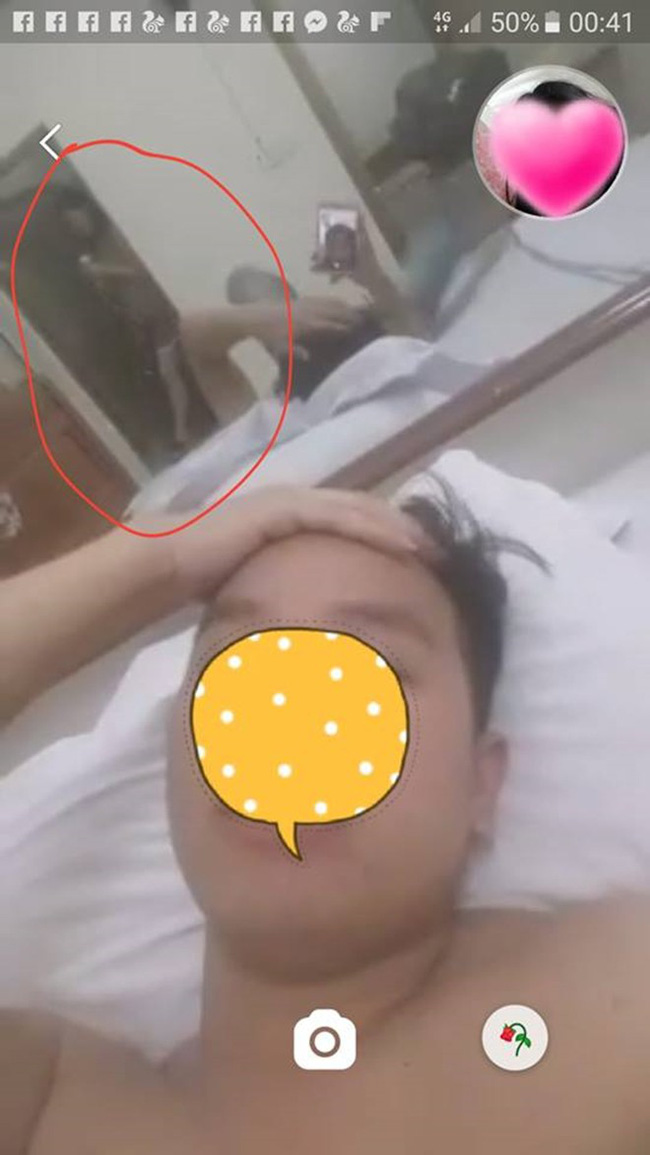 Chồng gọi luôn diễn như không có gì. Lúc đầu em cũng không để ý nhưng về sau em nhìn vào gương thì thấy như vậy (như ảnh). Người em run rẩy, tim đập loạn không thở nổi. Em vội chụp màn hình lại. Em cố giữ bình tĩnh bảo chồng ra quay nhà vệ sinh cho xem thì chồng ra hiệu cho đứa kia né ra cửa chính.
