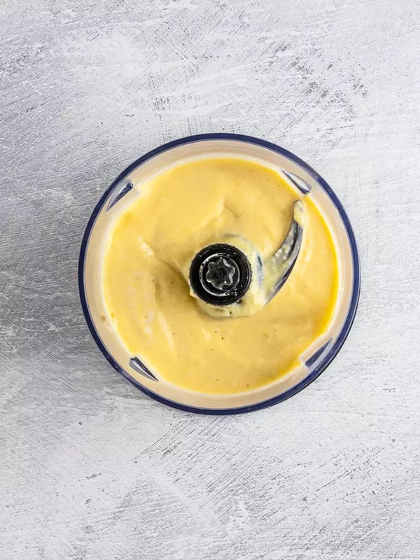 Bước 2: Gọt vỏ, cắt xoài thành miếng nhỏ. Thêm xoài đã cắt nhỏ, sữa chua Hy Lạp và bơ hạnh nhân vào máy xay. Xay nhuyễn mịn hỗn hợp.