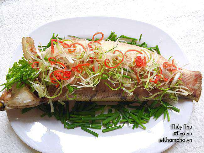 Lót hành tây vào đáy đĩa rồi cho cá lên sau đó đem hấp chín. Khi cá chín, cho hành lá và ớt cắt sợi lên trên và bày ra đĩa thật đẹp mắt.
