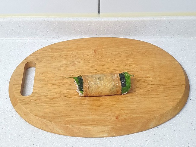Bước 5: Đặt vỏ đậu phụ chiên ra thớt, thêm 1 lá kim lên trên.