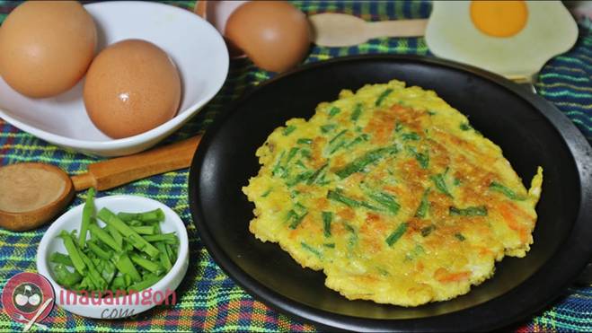 Sau đó, tắt bếp và lật trứng để mặt còn lại của trứng xuống chảo rồi bật lửa nhỏ tầm 2 phút là có món trứng chiên hẹ thơm phức. Để trông đẹp mắt hơn, trong quá trình chiên bạn có thể cuộn trứng lại. Khi hoàn thành, lấy ra đĩa và dùng dao cắt đều thành từng miếng hình chữ nhật.
