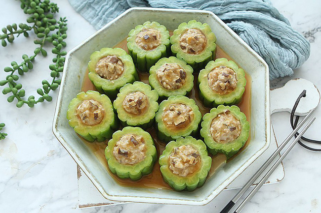 Thịt rửa sạch băm nhỏ cho vào bát. Nấm hương ngâm mềm rồi thái nhỏ. Đập trứng vào bát thịt. Thêm nước tương, dầu hào, muối, đường và rượu nấu ăn vào trộn đều. Mướp đắng cắt khúc, loại bỏ hạt rồi rửa sạch.