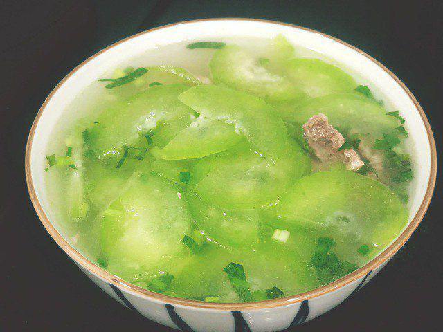 Chuẩn bị: 300g bí đao, 150g xương cục, hành lá, mùi tàu, gia vị, muối