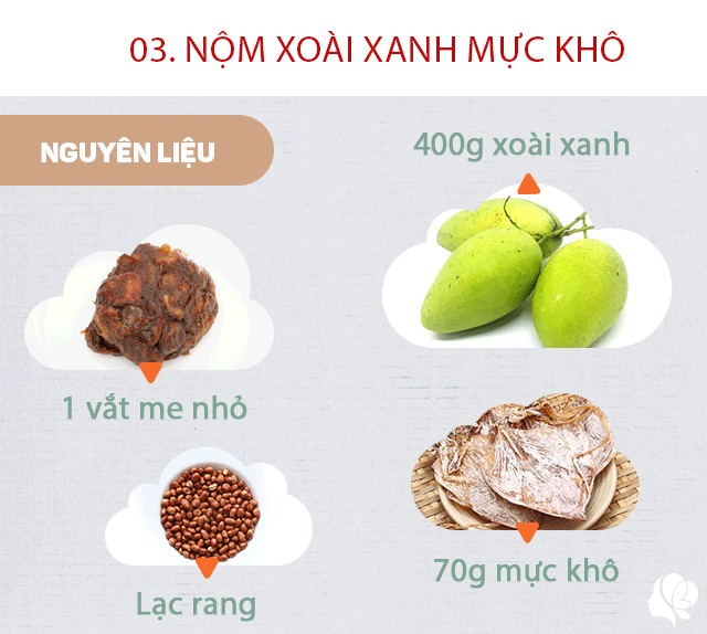 Nguyên liệu: - 1 trái xoài xanh khoảng 400g - 70g mực khô (chọn loại mực nhỏ) - 1 vắt me nhỏ - 30g lạc rang - Rau răm, tỏi, gừng, ớt - Nước mắm, đường.
